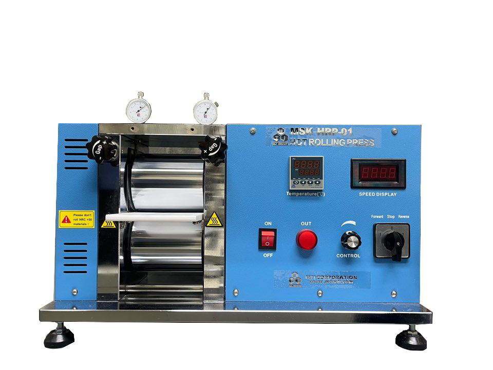 롤프레스 장비는 가열 가능한 금속 롤러를 이용해 배터리 전극 시트를 일정 압력으로 압연하여 두께를 균일하게 하고 전극 밀도를 향상시키는 장비이다. 최대 100 °C까지 가열 가능한 100 mm 폭의 롤러를 통해 전극의 공극률과 기계적 안정성을 조절할 수 있으며, 코팅된 전극의 후처리 과정에서 활물질의 치밀화를 유도하는 데 사용된다.