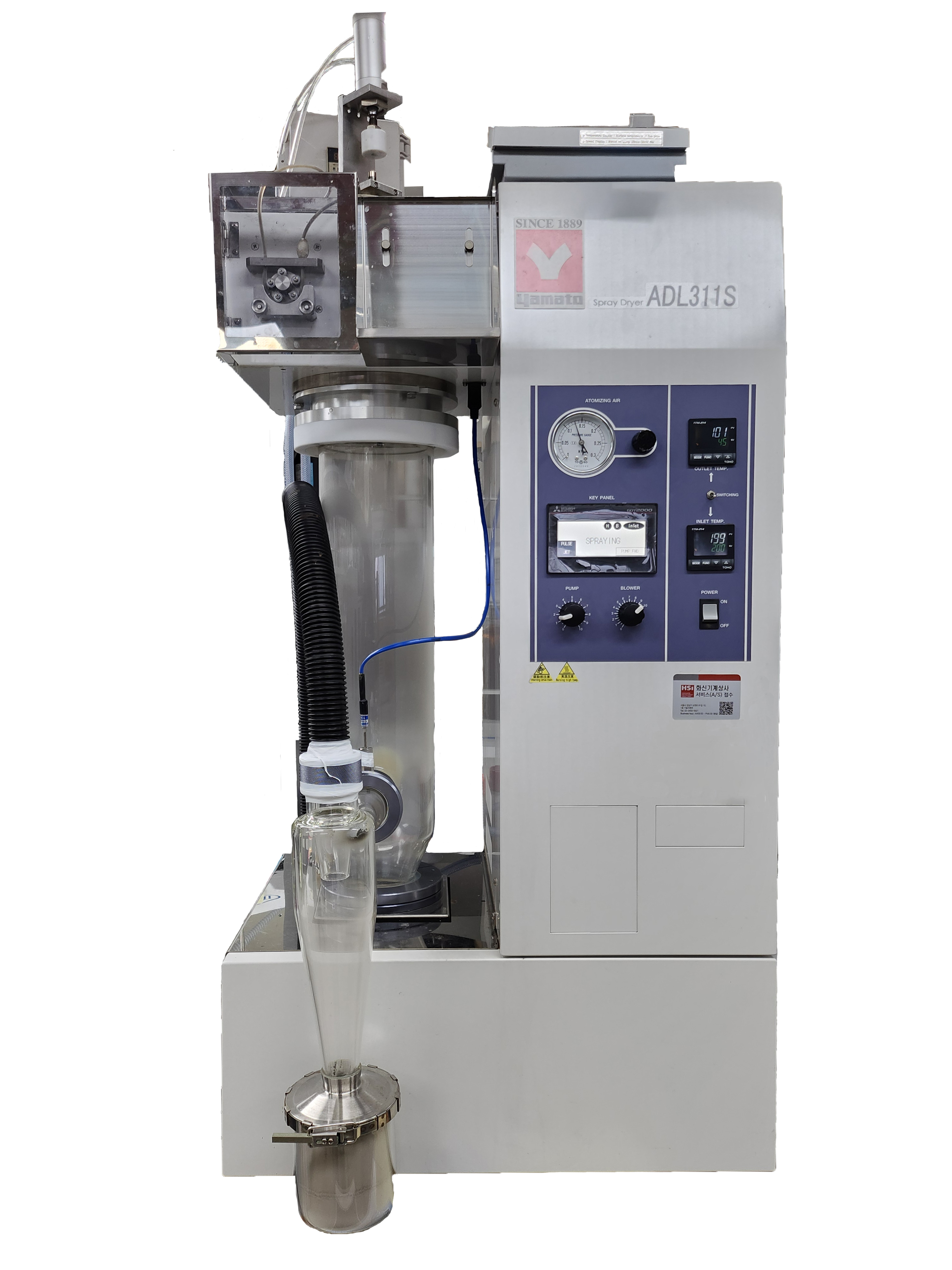 용액 또는 슬러리를 미세 액적으로 분사한 후, 고온의 건조 공기와 순간적으로 접촉시켜 액체를 즉시 증발시키고 고체 분말을 제조하는 장비이다. 액적은 노즐을 통해 미세한 분무 형태로 만들어지고, 챔버 내부에서 열풍과 접촉하면서 빠르게 건조된다. 이 과정에서 구형의 미세 분말 또는 건조된 고체 잔사가 생성된다.