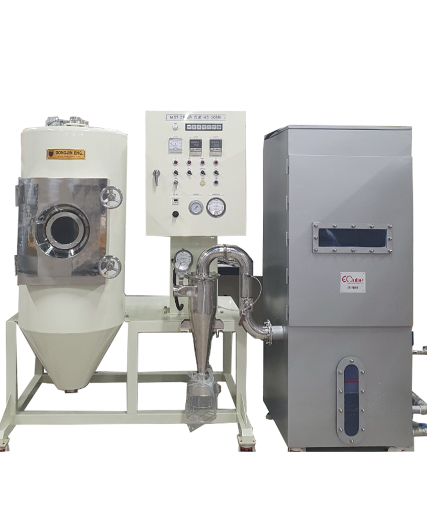 용액 또는 슬러리를 미세 액적으로 분사한 후, 고온의 건조 공기와 순간적으로 접촉시켜 액체를 즉시 증발시키고 고체 분말을 제조하는 장비이다. 액적은 노즐을 통해 미세한 분무 형태로 만들어지고, 챔버 내부에서 열풍과 접촉하면서 빠르게 건조된다. 이 과정에서 구형의 미세 분말 또는 건조된 고체 잔사가 생성된다.